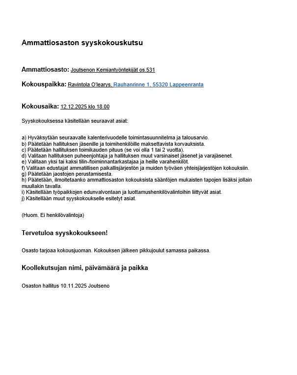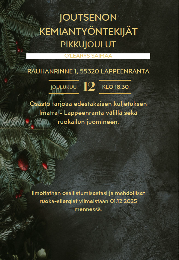 Syyskokous & pikkujoulut 12.12.2025. Ravintola O*Learys, Rauhanrinne 1, 55320 Lappeenranta. Klo 18.00